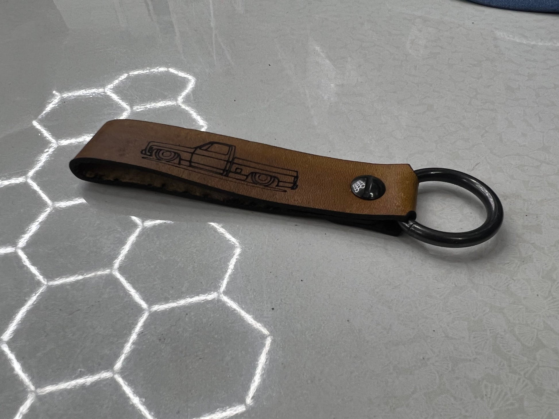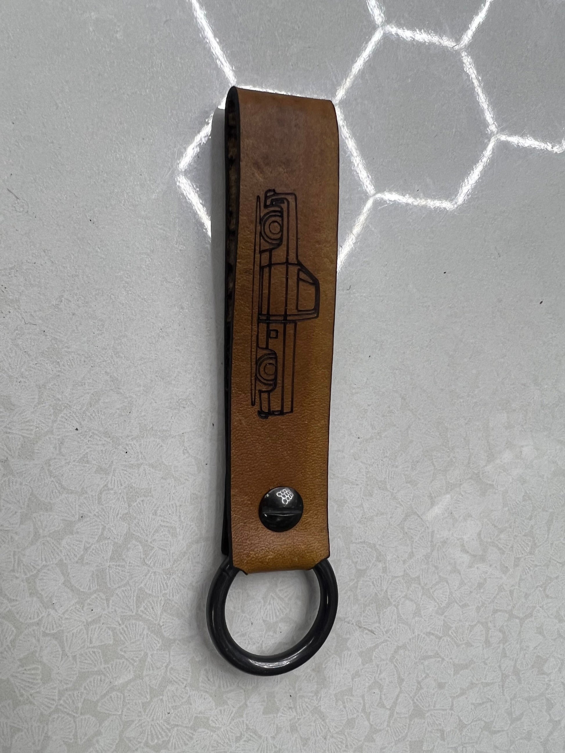 Handmade leather strap Silverado squarebody c10 keychain with antique nickel o ring.
