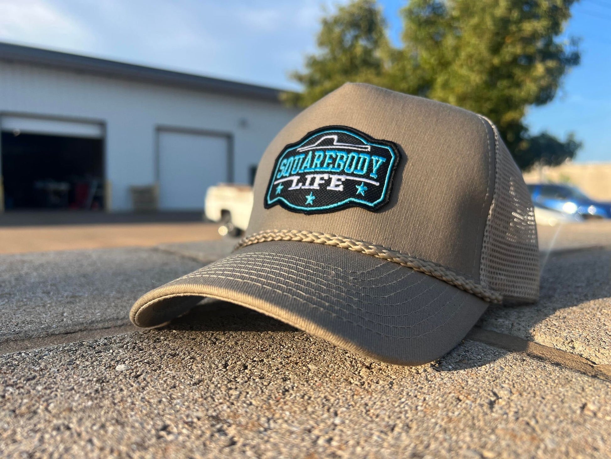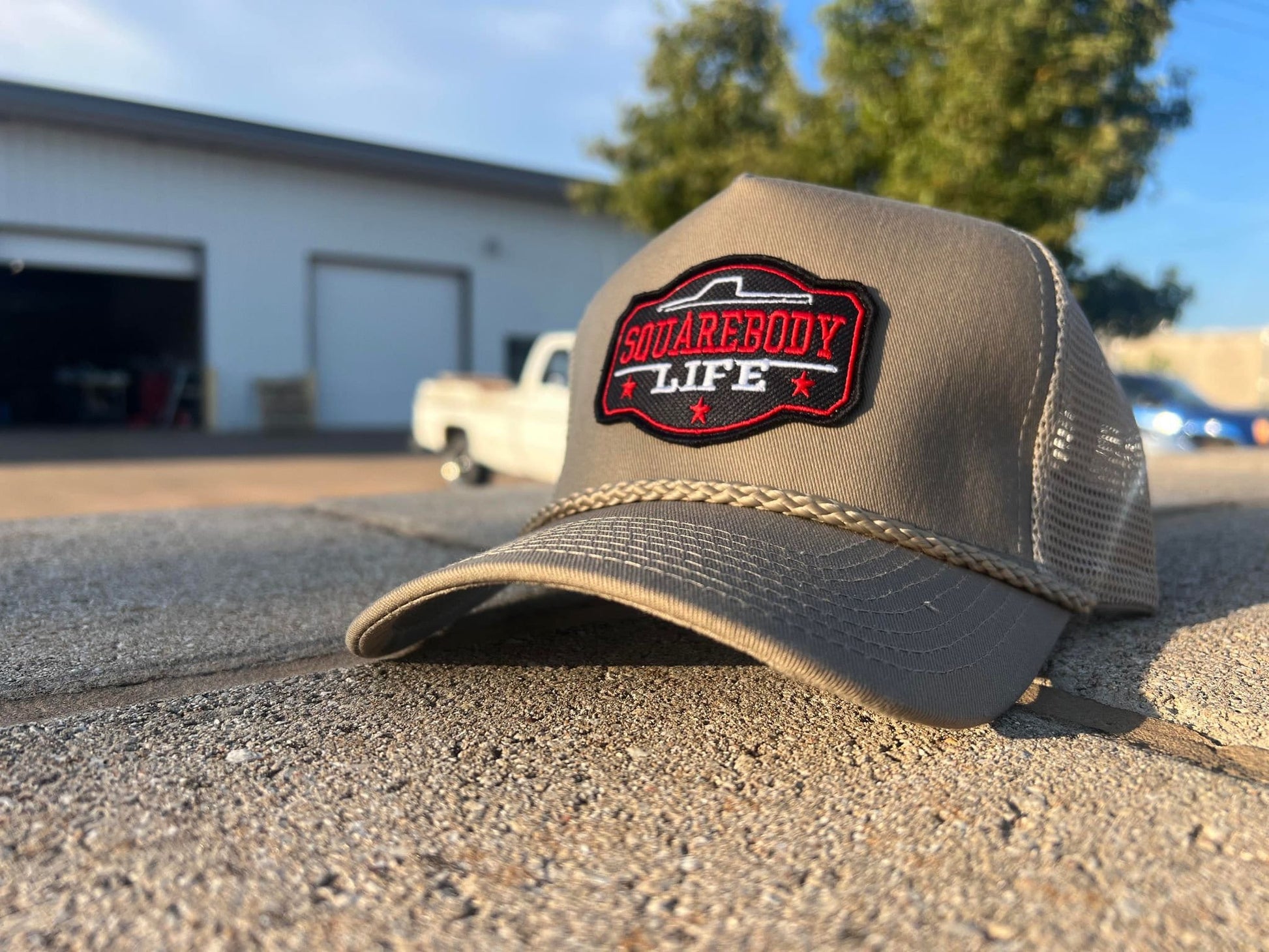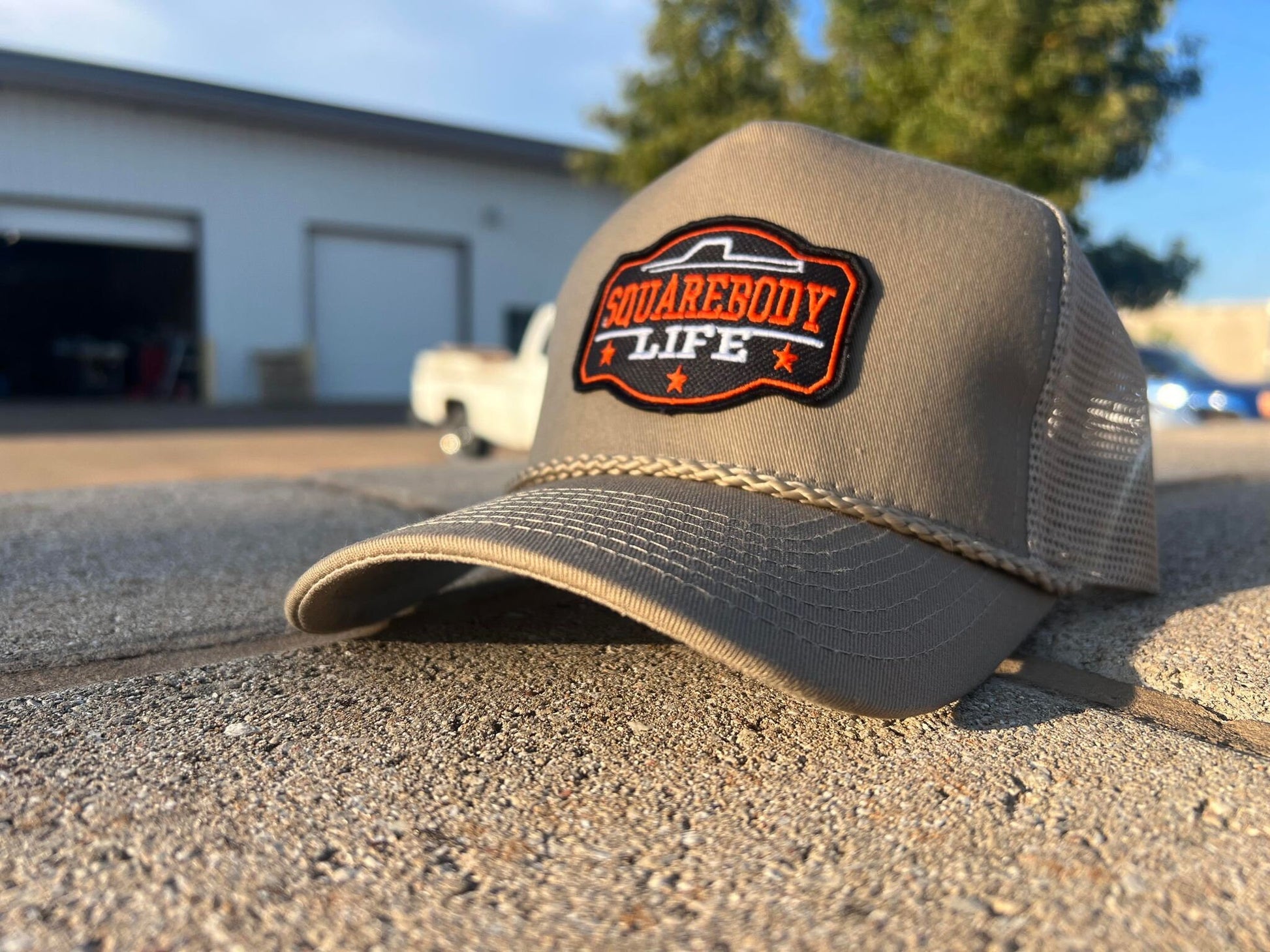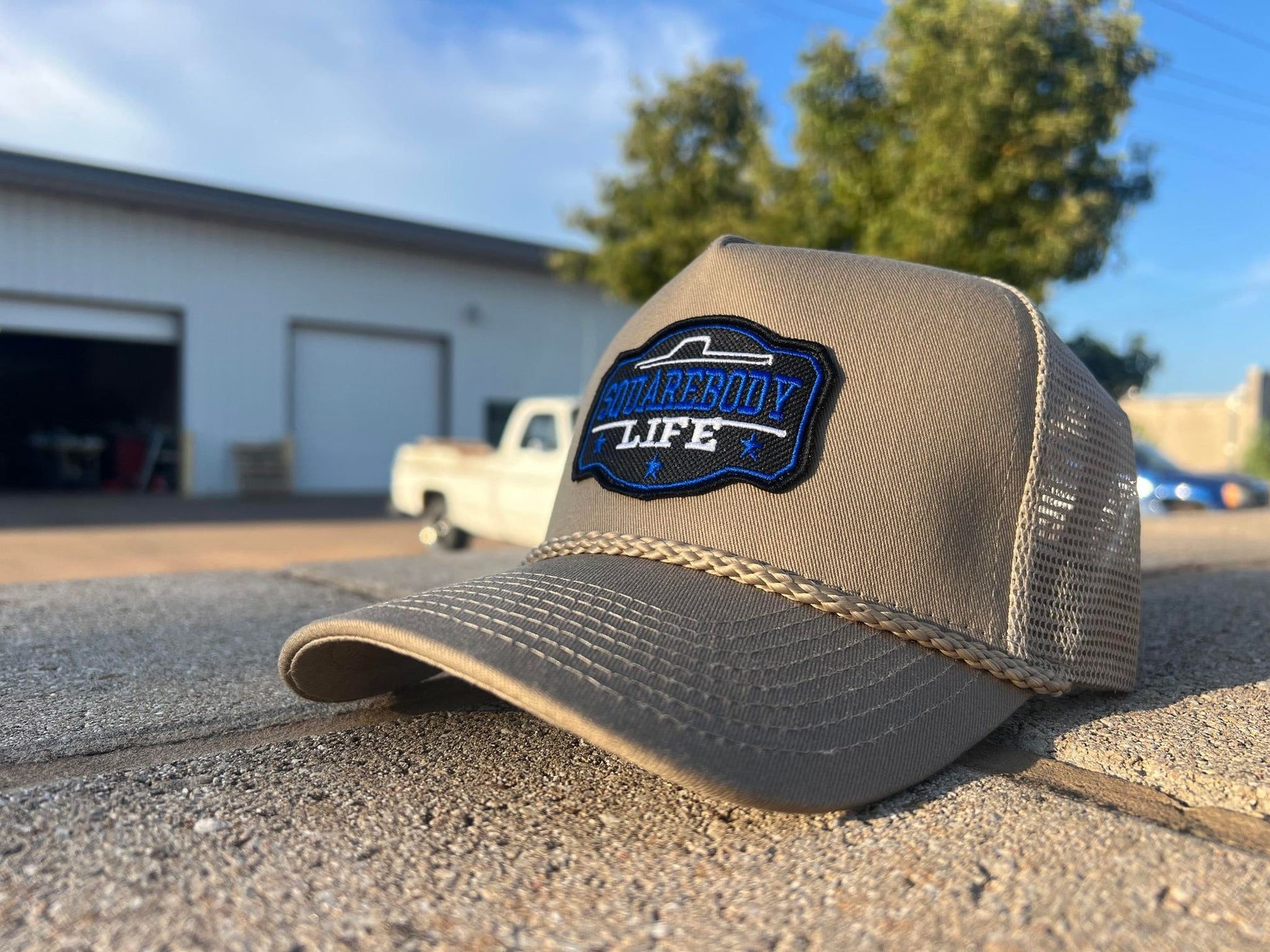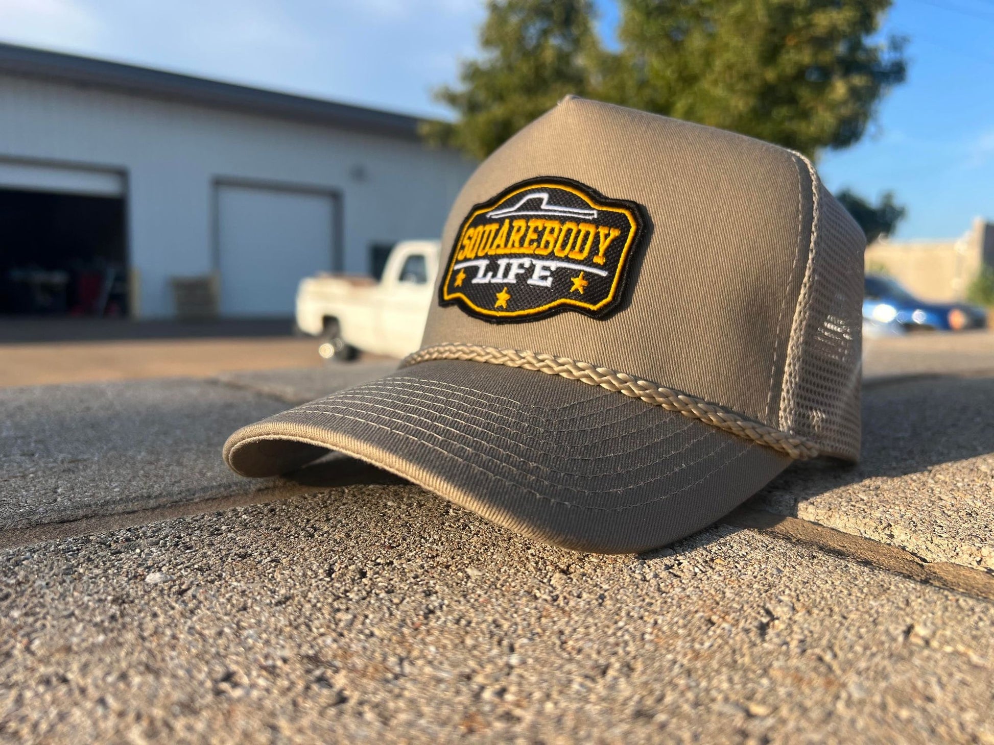 Vintage GM Squarebody Rope Snapback Khaki Trucker Mesh Hat with Patch - Classic Chevy GM GMC Truck Apparel for Men and Women